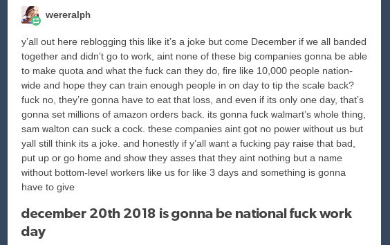 General strikes are a big deal. They need organization, mass support, an agreed-upon list of demands, related demonstrations, etc. It’s not as easy as 10k people across the country at multiple different jobs not showing up – despite what you think, that will be seen as 10k independent occurrences and will result in several thousand firings for no call/no shows with no other notice paid. Even if this wildcat general strike gets enough traction to be seen as an actual threat (which is unlikely as just a viral tumblr post), the government will simply respond with arrests and brutality as they have in the past, and no part of this post prepares people for that