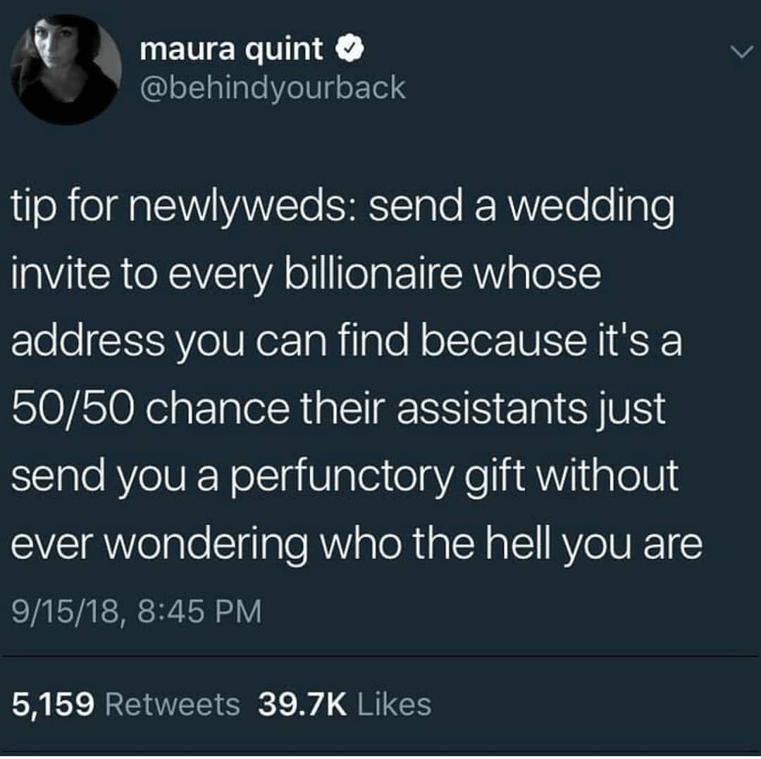 If I were a billionaire I would absolutely tell my secretary to send wedding gifts to anyone who sent me an invite regardless of if I knew them, because- A. I know how expensive that nonsense is. B. I would be a billionaire and when else am I gonna do with that much money? Honestly… and C. I would totally make showing up at random weddings with crazy awesome gifts my new stress relief hobby. “Congratulations random strangers! I admire your daring and stratigic planning. Here’s that 700$ tea set you wanted but assumed no one would ever buy.”